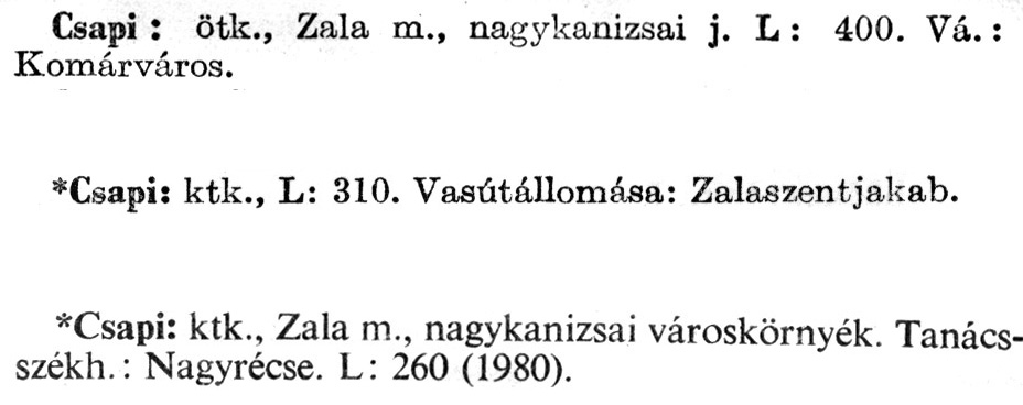 Nyilvános 2404 | 6453 | A szócikkek felismertetett szövege: | (Az első csillag után az 1972-es, a második csillag után az 1981-es kiadású kiegészítő kötetből származó szöveg következik) Csapi: ötk., Zala m., nagykanizsai j. L : 400. Vá.: Komárváros. *Csapi: ktk., L: 310. Vasútállomása: Zalaszentjakab. *Csapi: ktk., Zala m., nagykanizsai városkörnyék. Tanács-székh.: Nagyrécse. L: 260 (1980). A szócikkek a következő lexikonból származnak: Cím: Új magyar lexikon Közreműködő: Berei Andor (1900-1979) (szerk.) Szerz. közl.: [szerk. Berei Andor et al.] Kiadás jelzés: 2. lny. Kiadás: Budapest : Akad. K., 1961-1962 Kötetei: 1., A - C 2., D - F 3., G - J 4., K - Me 5., Mf - R 6., S - Z 7. köt., A-Z Kiegészítő kötet (1972) Kiegészítő kötet, 1962÷1980 (1981) ETO jelzet: 03=945.11 Szakjelzet: 030 Cutter: U 28 Nyelv: magyar Megjegyzés: Bibliogr. a címszavak egy részének végén |