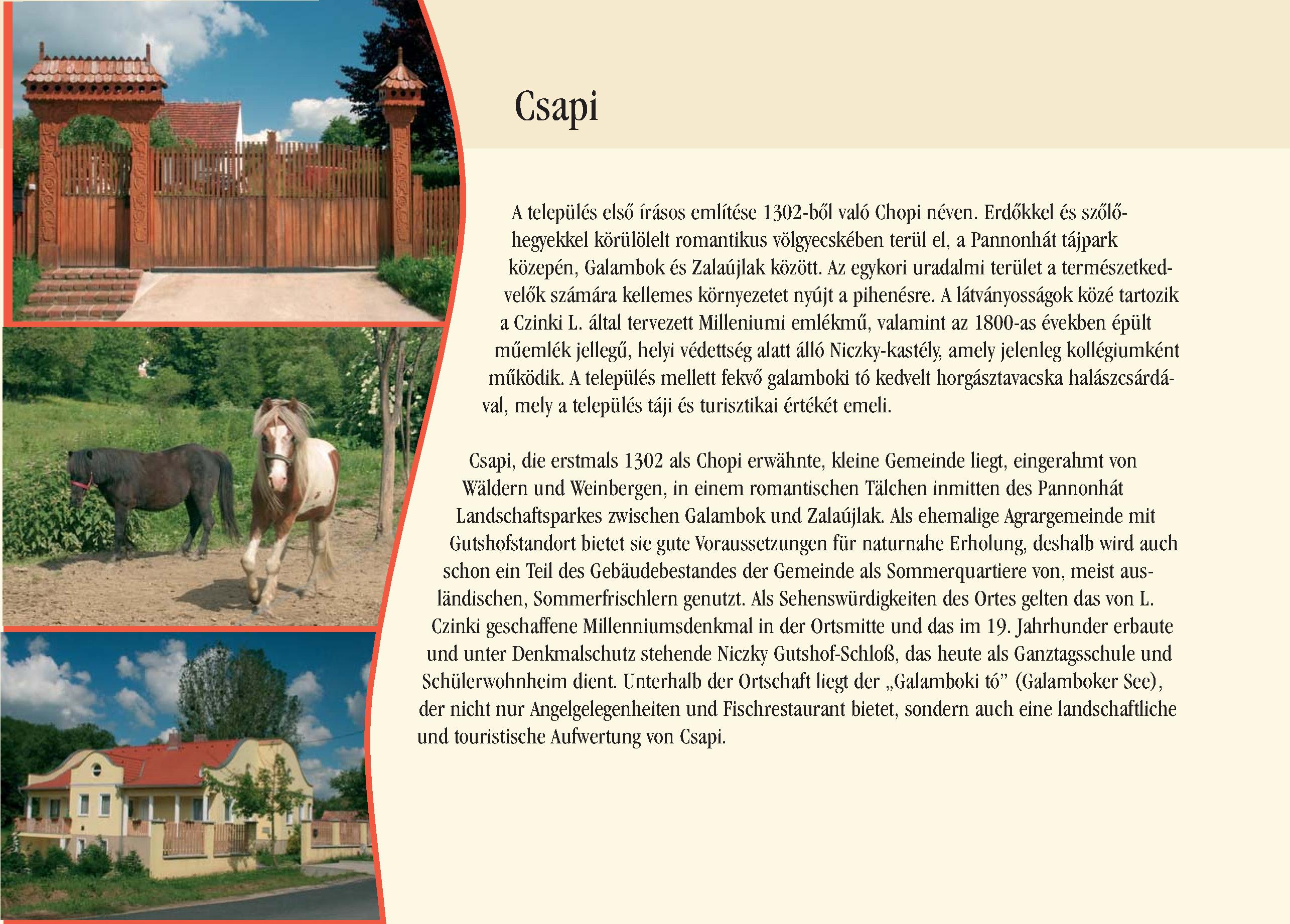 Nyilvános 2529 | 8778 | Csapi | Csapi, die erstmals 1302 als Chopi erwähnte, kleine Gemeinde liegt, eingerahmt von Wäldern und Weinbergen, in einem romantischen Tälchen inmitten des Pannonhát Landschaftsparkes zwischen Galambok und Zalaújlak. Als ehemalige Agrargemeinde mit Gutshofstandort bietet sie gute Voraussetzungen für naturnahe Erholung, deshalb wird auch schon ein Teil des Gebäudebestandes der Gemeinde als Sommerquartiere von, meist ausländischen, Sommerfrischlern genutzt. Als Sehenswürdigkeiten des Ortes gelten das von L. Czinki geschaffene Millenniumsdenkmal in der Ortsmitte und das im 19. Jahrhunder erbaute und unter Denkmalschutz stehende Niczky Gutshof-Schloß, das heute als Ganztagsschule und Schülerwohnheim dient. Unterhalb der Ortschaft liegt der ,,Galamboki tó" (Galamboker See), der nicht nur Angelgelegenheiten und Fischrestaurant bietet, sondern auch eine landschaftliche und touristische Aufwertung von Csapi. Dieses Text stammt von: Pannonhát tájpark prospektus 2006. Web: http://www.pannonhat.hu/ (auch in Deutsch) |