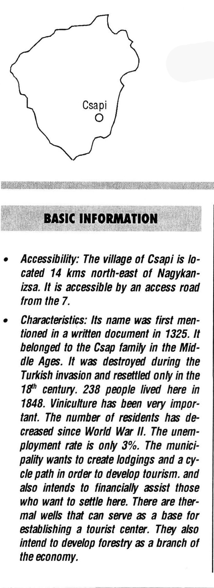 Nyilvános 2347 | 7891 | Csapi | BASIC INFORMATION • Accessibility: The village of Csapi is located 14 kms north-east of Nagykanizsa. It is accessible by an access road from the 7. • Characteristics: Its name was first mentioned in a written document in 1325. It belonged to the Csap family in the Middle Ages. It was destroyed during the Turkish invasion and resettled only in the 18th century. 238 people lived here in 1848. Viniculture has been very important. The number of residents has decreased since World War II. The unemployment rate is only 3%. The municipality wants to create lodgings and a cycle path in order to develop tourism, and also intends to financially assist those who want to settle here. There are thermal wells that can serve as a base for establishing a tourist center. They also intend to develop forestry as a branch of the economy. This text came from the following book: Title: Handbook of Zala county (Zala megye kézikönyve) Series: County handbooks of Hungary (Magyarország megyei kézikönyvei) Chief editor: Hóbor József Publisher: (Hatvan), CEBA-Hungary Ltd, 1998 ETO: 908.439.121(035) ; 050.8(439.121) ISBN: 963-9089-18-2 Pages: 488-1040 p. Remark: Closed on: 1998. márc. 31. |
