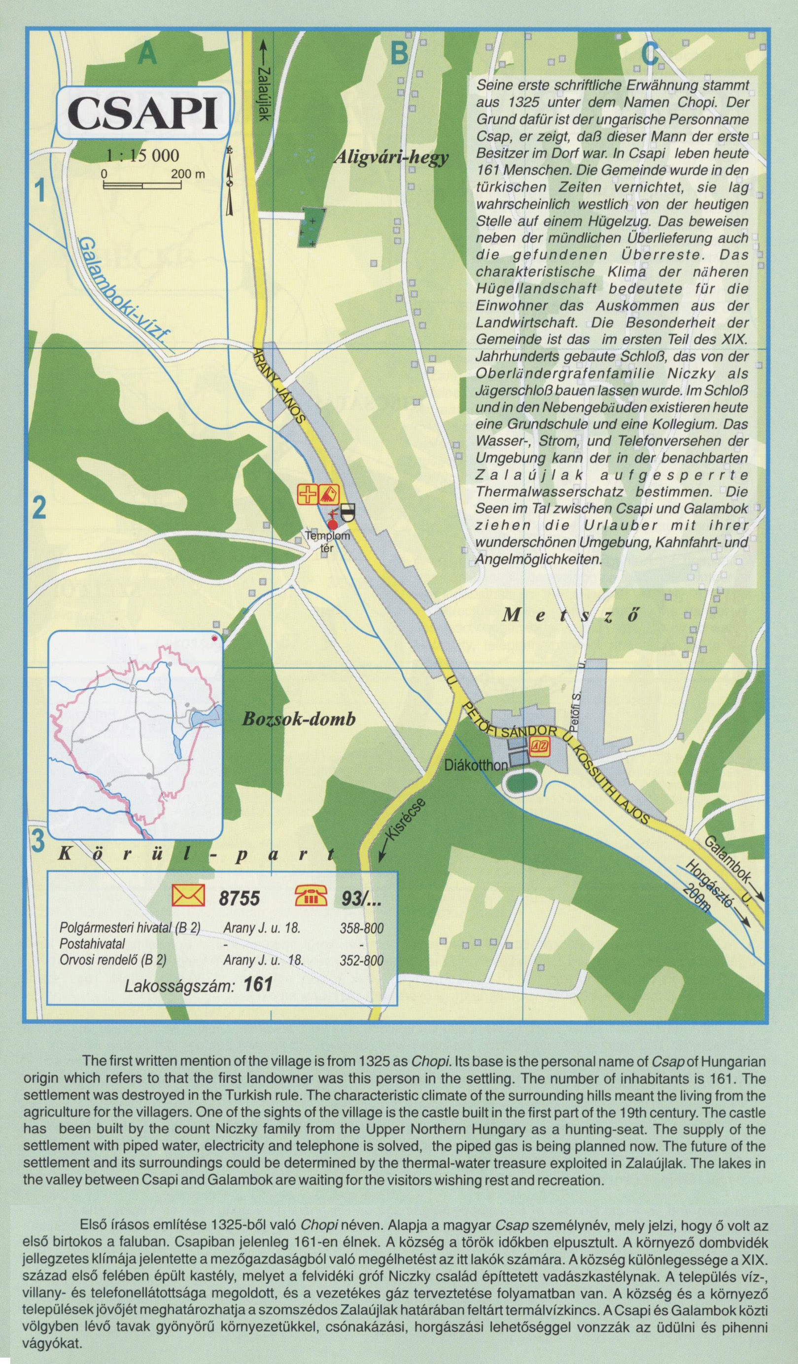 Nyilvános 2354 | 8031 | CSAPI | Első írásos említése 1325-ből való Chopi néven. Alapja a magyar Csap személynév, mely jelzi, hogy ő volt az első birtokos a faluban. Csapiban jelenleg 161-en élnek. A község a török időkben elpusztult. A környező dombvidék jellegzetes klímája jelentette a mezőgazdaságból való megélhetést az itt lakók számára. A község különlegessége a XIX. század első felében épült kastély, melyet a felvidéki gróf Niczky család építtetett vadászkastélynak. A település víz-, villany- és telefonellátottsága megoldott, és a vezetékes gáz terveztetése folyamatban van. A község és a környező települések jövőjét meghatározhatja a szomszédos Zalaújlak határában feltárt termálvízkincs. ACsapi és Galambok közti völgyben lévő tavak gyönyörű környezetükkel, csónakázási, horgászási lehetőséggel vonzzák az üdülni és pihenni vágyókat. Seine erste schriftliche Erwähnung stammt aus 1325 unter dem Namen Chopi. Der Grund dafür ist der ungarische Personname Csap, er zeigt, daß dieser Mann der erste Besitzer im Dorf war. In Csapi leben heute 161 Menschen. Die Gemeinde wurde in den türkischen Zeiten vernichtet, sie lag wahrscheinlich westlich von der heutigen Stelle auf einem Hügelzug. Das beweisen neben der mündlichen Überlieferung auch die gefundenen Überreste. Das charakteristische Klima der näheren Hügellandschaft bedeutete für die Einwohner das Auskommen aus der Landwirtschaft. Die Besonderheit der Gemeinde ist das im ersten Teil des XIX. Jahrhunderts gebaute Schloß, das von der Oberländergrafenfamilie Niczky als Jägerschloß bauen lassen wurde. Im Schloß und in den Nebengebäuden existieren heute eine Grundschule und eine Kollegium. Das Wasser-, Strom, und Telefonversehen der Umgebung kann der in der benachbarten Z a I a ú j I a k aufgesperrte Thermalwasserschatz bestimmen. Die Seen im Tal zwischen Csapi und Galambok ziehen die Urlauber mit ihrer wunderschönen Umgebung, Kahnfahrt- und Angelmöglichkeiten. The first written mention of the village is from 1325 as Chopi. Its base is the personal name of Csap of Hungarian origin which refers to that the first landowner was this person in the settling. The number of inhabitants is 161. The settlement was destroyed in the Turkish rule. The characteristic climate of the surrounding hills meant the living from the agriculture for the villagers. One of the sights of the village is the castle built in the first part of the 19th century. The castle has been built by the count Niczky family from the Upper Northern Hungary as a hunting-seat. The supply of the settlement with piped water, electricity and telephone is solved, the piped gas is being planned now. The future of the settlement and its surroundings could be determined by the thermal-water treasure exploited in Zalaújlak. The lakes in the valley between Csapi and Galambok are waiting forthe visitors wishing rest and recreation. A részlet a következő kiadványból származik/Die Teile stammen vom volgenden Buch/This text came from the following book: Cím/Titel/Title: Zala megye településeinek atlasza - 257 település részletes térképe/Atlas der Komitat Zala - 257 Detailte Siedlungskarten/Zala county\'s Atlas - 257 settlement maps. Közreműködő/contributor: Lackner László (1943) (fotó) Kiadás/Ausgabe/Publisher: Gyula : HISZI-MAP, 1997 Sorozat/Serie/Series: Indulástól - megérkezésig... ETO: 912(439.121-2) ; 908.439.121 Cutter: Z 19 ISBN: 963-610-025-4 Oldalszám/Seiten/Pages: 323, 81 p. Megjegyzés/Note: Lezárva/Abgeschlossen am/Closed am: 1997. máj. 30. |